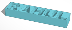 I decided that I should also create a name plate for The Daughter. She has been a big fan of some of the 3D printed doo dads I’ve made. So I used the same approach as I did with my co-workers, creating a block, and then dragging individual letters over the block and creating a void with their shapes. Here’s her nameplate.